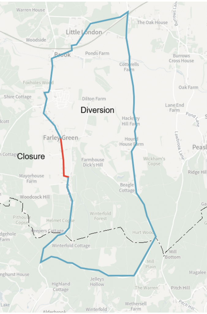 Alternative route: Row Lane (D194), Winterfold Heath Road (D194), Winterfold Heath Road (D193), Windmill Plain (D192), Hound House Road (C46), Shere Heath Road (D222), Little London (D222), Brook Lane (D222), Brook Hill (D194) and Shophouse Lane (D194) or the same route in reverse.